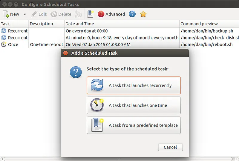如果你在Linux桌面环境中,你可以使用crontab的更加友好的GUI前端来添加或者添加一个cron任务。