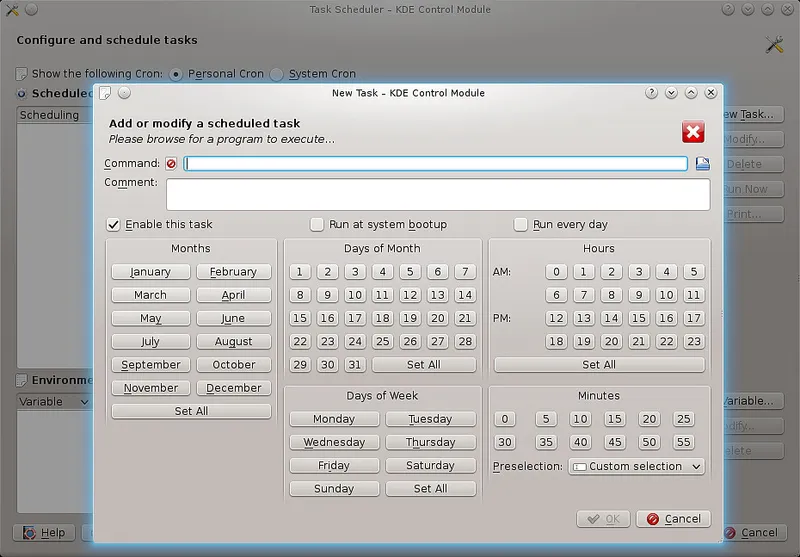 在KDE桌面中,有一个Task Scheduler(kcron包)。