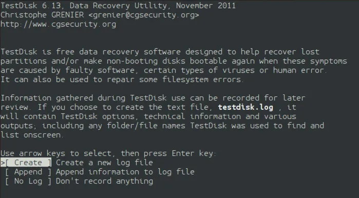 现在, TestDisk 命令行应用将会被执行。终端的显示将会改变。TestDisk 询问用户它是否可以保留日志,这完全由用户决定。假如一个用户正从系统存储中恢复文件,则不必保留日志。可选择的选项有“生成”、 “追加” 和 “无日志”。假如用户想保留日志,则日志将会保留在该用户的主目录。