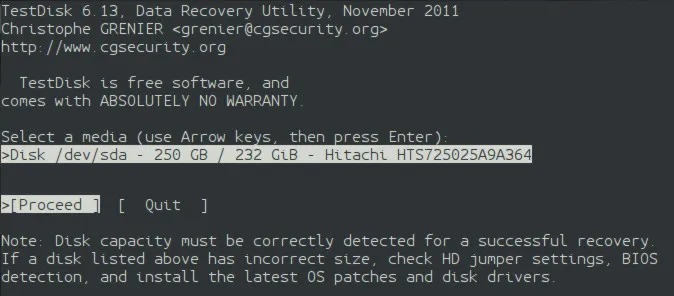 使用 root 权限从终端中打开 TestDisk 可以通过键入 sudo testdisk 命令。