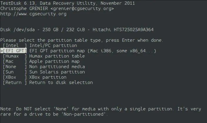 下一屏显示出一个列有分区表(也叫做分区映射表)的清单。正如文件有文件配置表,分区有着分区表。分区是存储设备上的分段。例如在几乎所有的 Linux 系统中,至少存在两种分区类型 – EXT3/4 和 Swap 。每一个分区表将会在下面被简要地描述。TestDisk 并不支持所有类型的分区表,所以这并不是完整的列表。