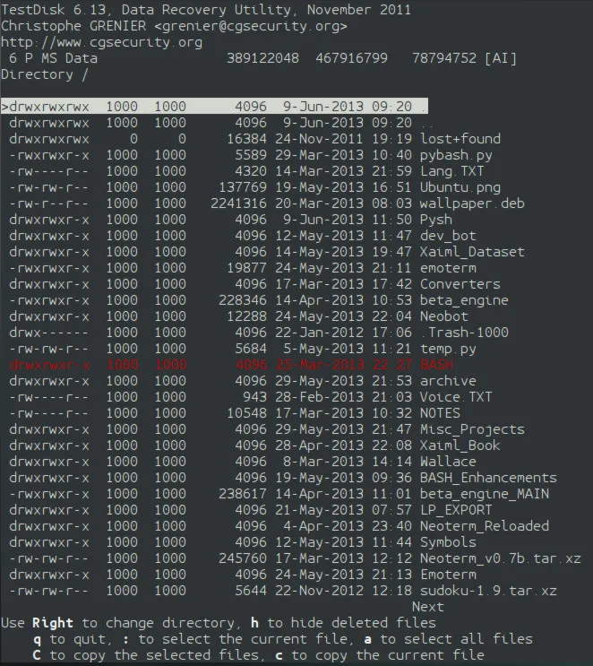 新的一屏便会呈现出列有文件和目录的列表。那些白色的文件名就是未被删除的文件,而红色的文件名是那些已被删除的文件。最右边的一列是文件的名称,从右到左方向的接着一列是文件的创建日期,再往左的一列是文件的大小(以 byte/ 比特为单位),最左边带有“-”,“d” ,“r”, “w” 和”x”的一列则代表的是文件的权限情况。“d” 表示该文件为一个目录,其他的权限术语与本文关系不大。在列表的最顶端以“.”代表的一项表示当前目录,第二行以”..”代表的一项表示当前目录的上级目录,所以用户可以通过选择目录所在行到达该目录。