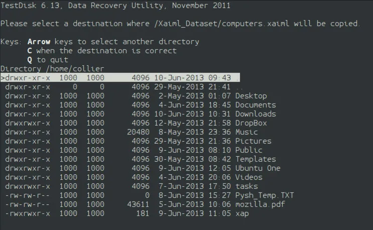 举个例子,我想进入”Xaiml_Dataset” 目录,该目录基本上由被删除的文件组成。通过按键盘上的 “c”键,我将恢复文件 “computers.xaiml”,接着我被询问选择一个目标目录,当然,我应该放置该文件到另一个分区中。现在,当我在我的家目录时,按下了“c”键。(选择目标目录时)哪个目录被高亮并没有什么影响,当前目录就是目标目录,在屏幕的上方,将会显示“复制完成”的消息。在我的家目录中便会有一个名为”Xaiml_Dataset”的目录,里面里有一个 Xaiml 文件。 假如我在更多的已删除文件上按“c” 键,则这些文件将会被放置到新的文件夹中而无需再向我询问目标目录。