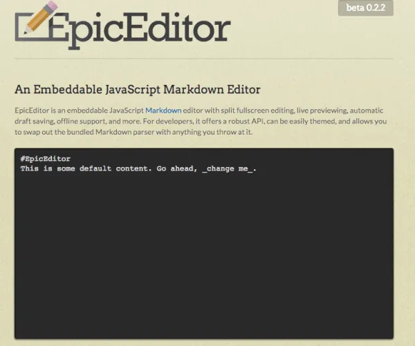EpicEditor是一个可嵌入的 JavaScript Markdown 编辑器,具有分割全屏进行编辑,实时预览,自动草稿保存,离线支持等特性。对于开发人员,它提供了健壮的API,可以容易地设置主题,并允许你以任何其他的事物来替换绑定的 Markdown 解析器。