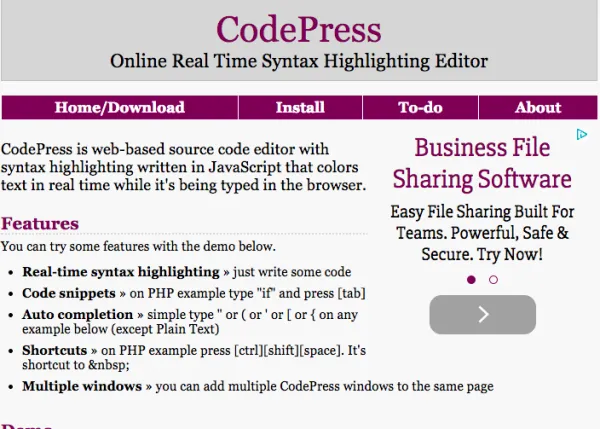 CodePress是一个基于网络的源代码编辑器,它用 JavaScript 编写,具有语法高亮,并且是在你将代码输入到浏览器后实时进行文本颜色渲染。