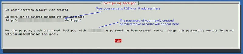 接着类似于下面的截屏将会呈现在你眼前,通知你创建了一个用来管理 BackupPC 的名为 ‘backuppc’的管理员用户以及相应的密码(如果你需要,这个密码以后可以更改)。这里需要注意的是:这里创建了同样名为 ‘backuppc’的 HTTP 账户和常规的 Linux 账户,它们使用相同的密码。需要前者的目的是来访问受保护的 BackupPC 的 Web 界面,而后者则是为了通过 SSH 来使用 rsync 来执行备份任务。