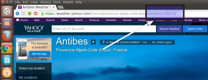 Flair Weather 使用 Yahoo 的天气服务,但它不能自动地识别你的位置。你需要手动地编辑它。到Yahoo 天气 网页,然后通过键入你的城市/Pin 码来得到你所在城市的位置 ID号。你可以从网页地址栏中取得位置 ID 号。