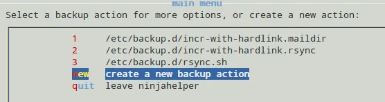 接下来我们将要创建helper文件(/usr/share/backupninja/home.helper)。这样,hendlers将会以菜单的形式在ninjahelper中显示: