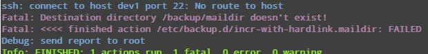 上面的图片告诉我们,用于完成备份操作的连接没有建立,因为它所需要链接的远程主机似乎宕机了。另外,在helper文件中指定的目标目录不存在。当纠正这些问题后,重新开始备份操作。