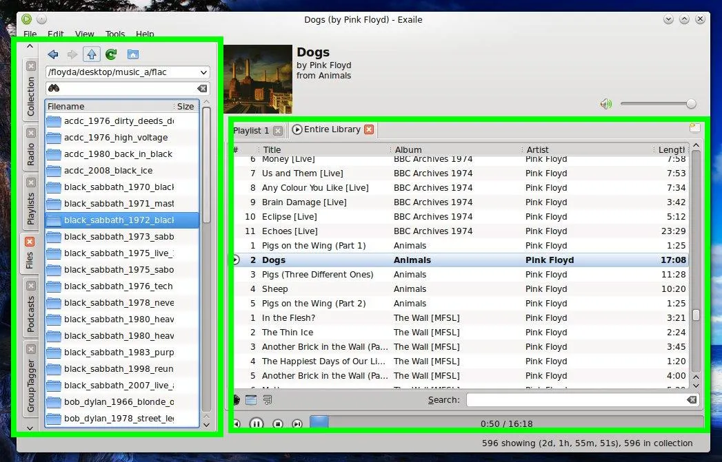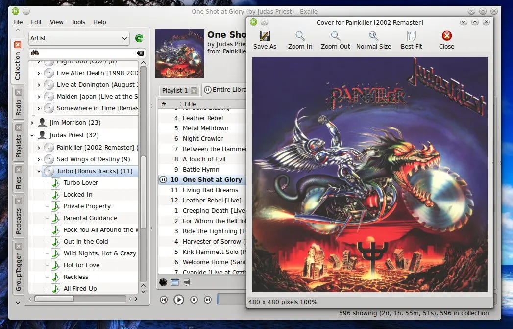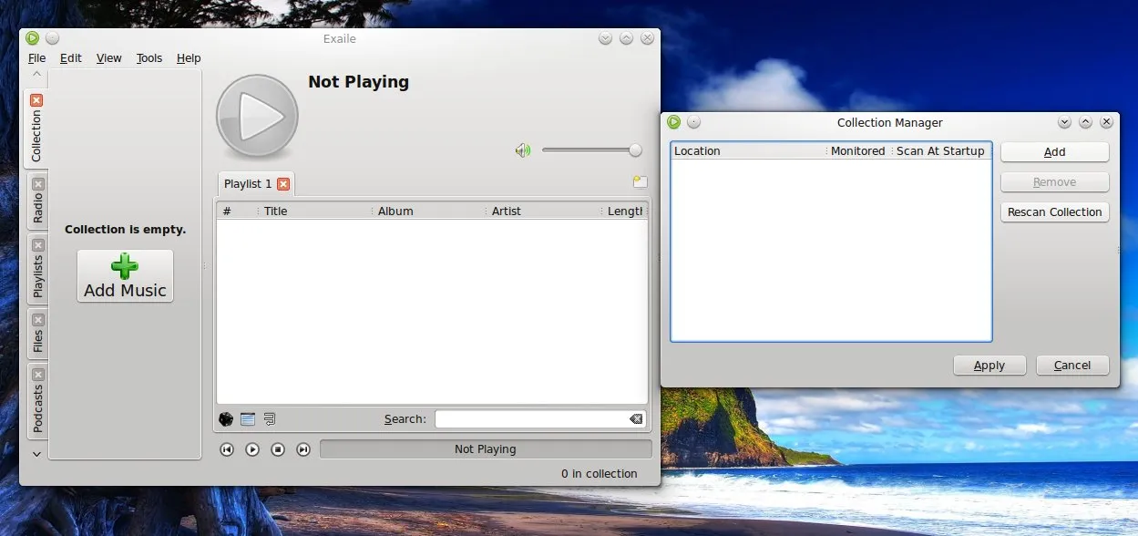 Exaile的功能几乎不尽其数。你可以在音乐集中组织音乐,听播客,对音乐进行评分,编辑标签,查看文件属性,排列歌曲,查看歌曲和封面,按照多种方式排序播放列表,更改播放行为和外观风格。