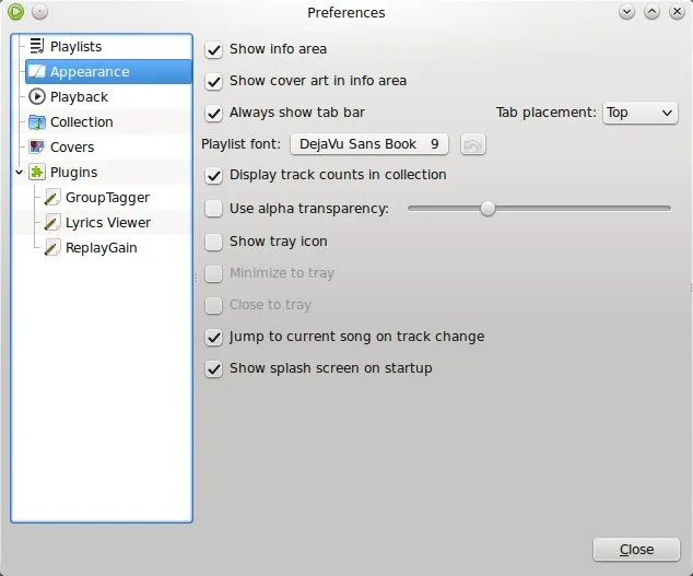首选项窗口允许配置Exaile的各个方面,包括启用或者禁用插件,外观,系统托盘集成或者播放模式。外观设置允许你更改标签的布局,显示或者隐藏便签栏,启用或者禁用透明性或者禁用启动画面。