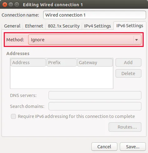 如果你在用NetworkManager来管理你的网络设置,你可以在NetworkManager里禁用IPv6。在NetworkManager打开wired connection,点击”IPv6 Settings”选项并在”Method”一栏选择”Ignore”,保存退出。