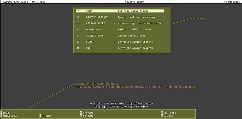 在你第一次启用 Alpine 时,它将在当前用户的家目录下创建一个邮件文件夹(~/mail),并显现出主界面,正如下面的视频所显示的那样:YOUTUBU 视频 – http://www.youtube.com/kuKiv3uze4U 。