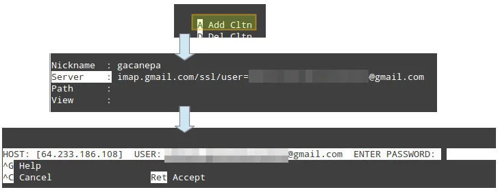 - Server: imap.gmail.com/ssl/user=yourgmailusername@gmail.com