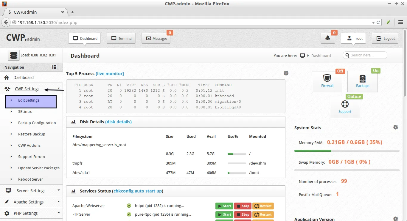在这篇教程中,我们看到了如何安装和配置CentOS网页面板,来创建一个简单的网站主机环境。CWP安装和使用非常简单。甚至一个菜鸟也可以在几个小时内建立一个基本的网站主机服务器。并且,CWP完全免费和开源。试一试吧!你不会失望的。