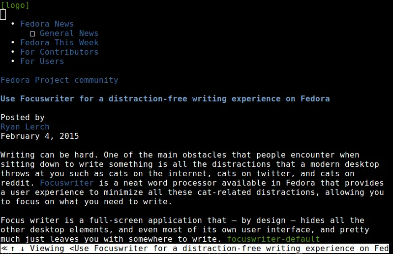 想阅读一篇特定的文章,可以在当前的文章上使用”o”健。它会调用w3m浏览器,并且在浏览器里面加载文章。当你读完之后,可以使用”q”健来退出浏览器,并返回到Feednix。如果你的电脑环境允许打开网页浏览器,你可以按”0″健来在你默认的网页浏览器里面加载文章,比如使用Firefox。