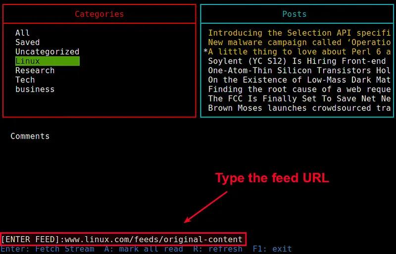 你可以在Feednix界面中来为你的Feedly账户增加任何一种RSS新闻源。要这么做,仅仅只需要按下”a”键,它会在屏幕底部显示一个”[ENTER FEED]:”的提示。在输入完RSS新闻源后,继续输入新闻源的名字和及其首选分类。