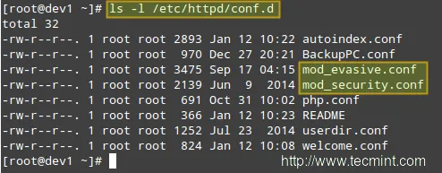 现在,为了整合这两个模块到Apache,并在启动时加载它们。请确保下面几行出现在mod_evasive.conf和mod_security.conf的顶层部分,它们分别为: