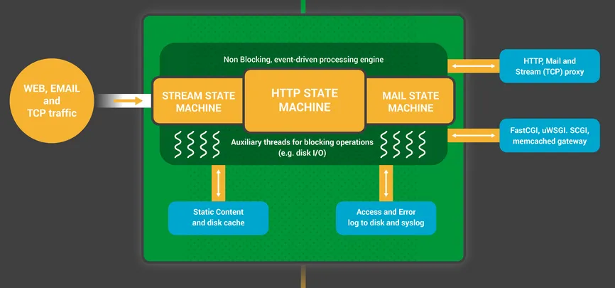 NGINX 工作进程首先在监听套接字上等待事件(accept_mutex 和内核套接字分片)。事件被新进来的连接初始化。这些连接被分配到一个状态机 – HTTP 状态机是最常用的,但 NGINX 也实现了流式(原始 TCP )状态机和几种邮件协议(SMTP、IMAP和POP3)的状态机。