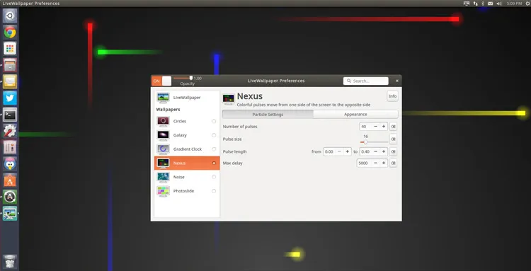 例如,Nexus主题中 (上图所示) 你可以更改脉冲粒子的数量,颜色,大小和出现频率。