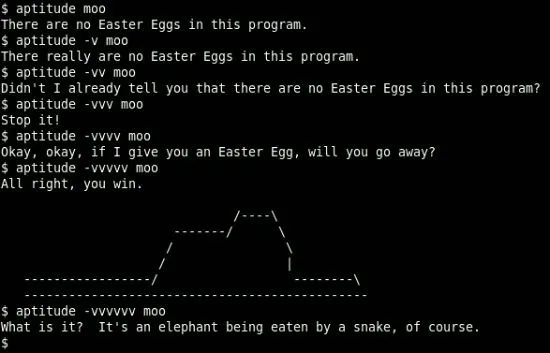 简单?的确。但这是只会说话的牛,所以惹我们喜欢。再试试“aptitude moo”。他会告诉你“There are no Easter Eggs in this program(这个程序里没有彩蛋)”。