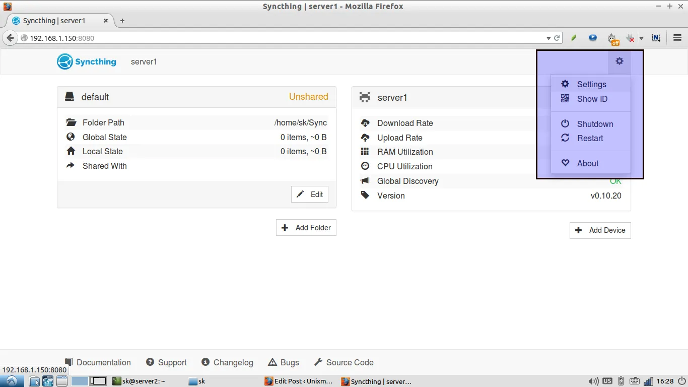 要在各个系统之间同步文件,你必须各自告诉它们其它服务器的信息。这是通过交换设备IDs(device IDs)来实现的。你可以通过选择“齿轮菜单(gear menu)”(在右上角)中的”Show ID(显示ID)“来找到它。