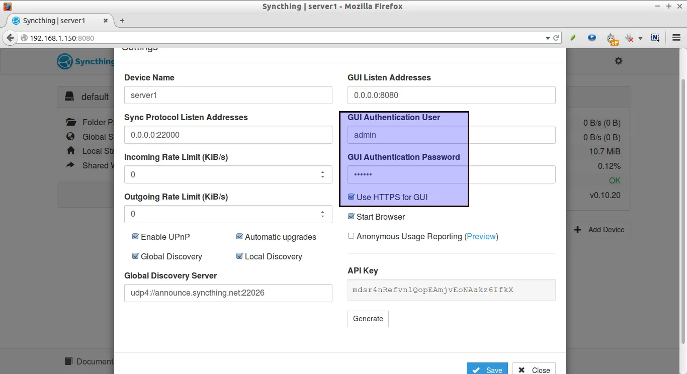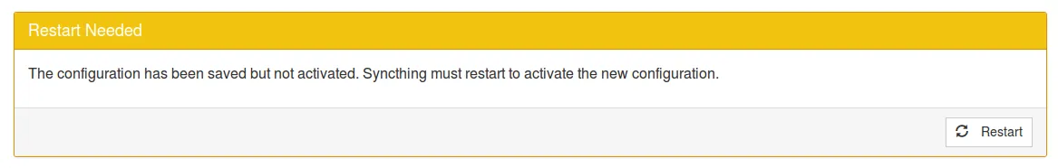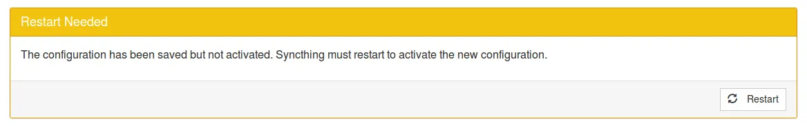 一旦完成了,点击save按钮。你会被要求重启Syncthing。点击Restart按钮重启使更改生效。