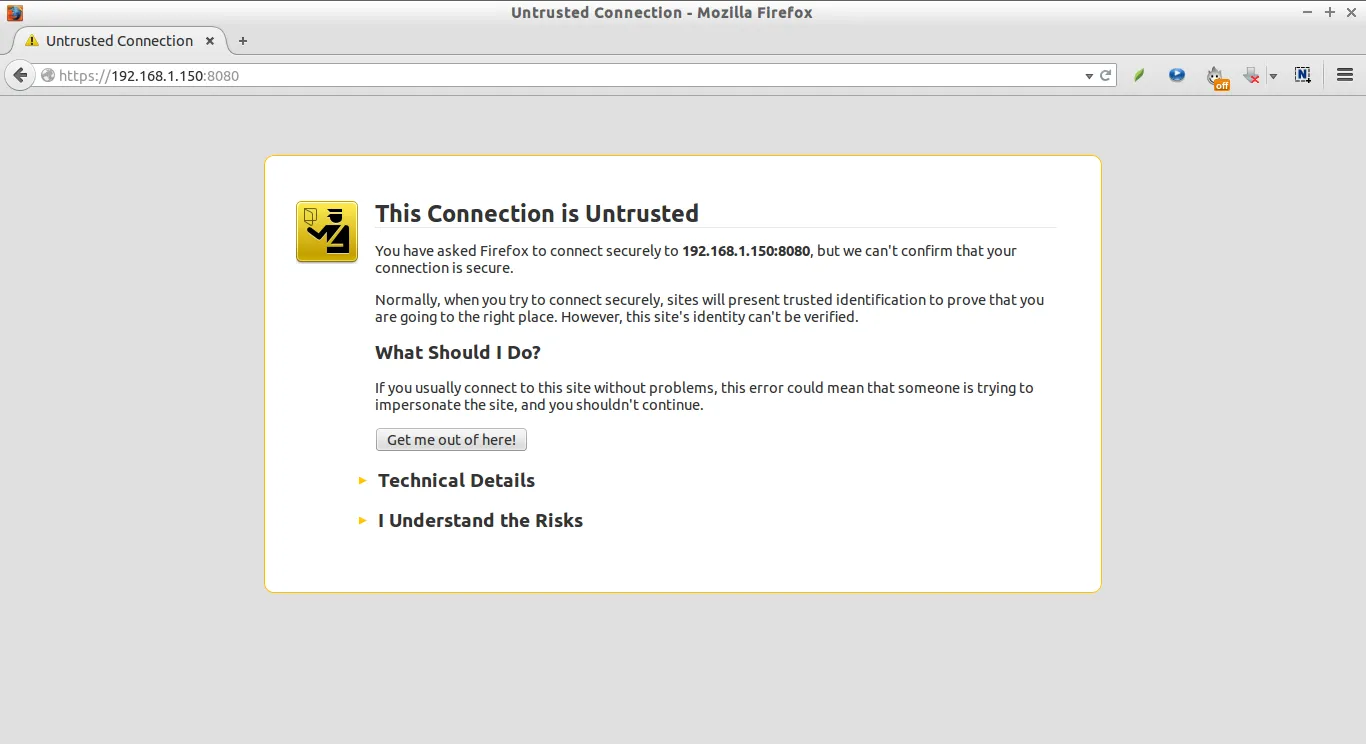 刷新你的网页浏览器。你可以看到一个像下面一样的SSL警告。点击显示我了解风险(I understand the Risks)的按钮。接着,点击“添加例外(Add Exception)“按钮把当前页面添加进浏览器的信任列表中。