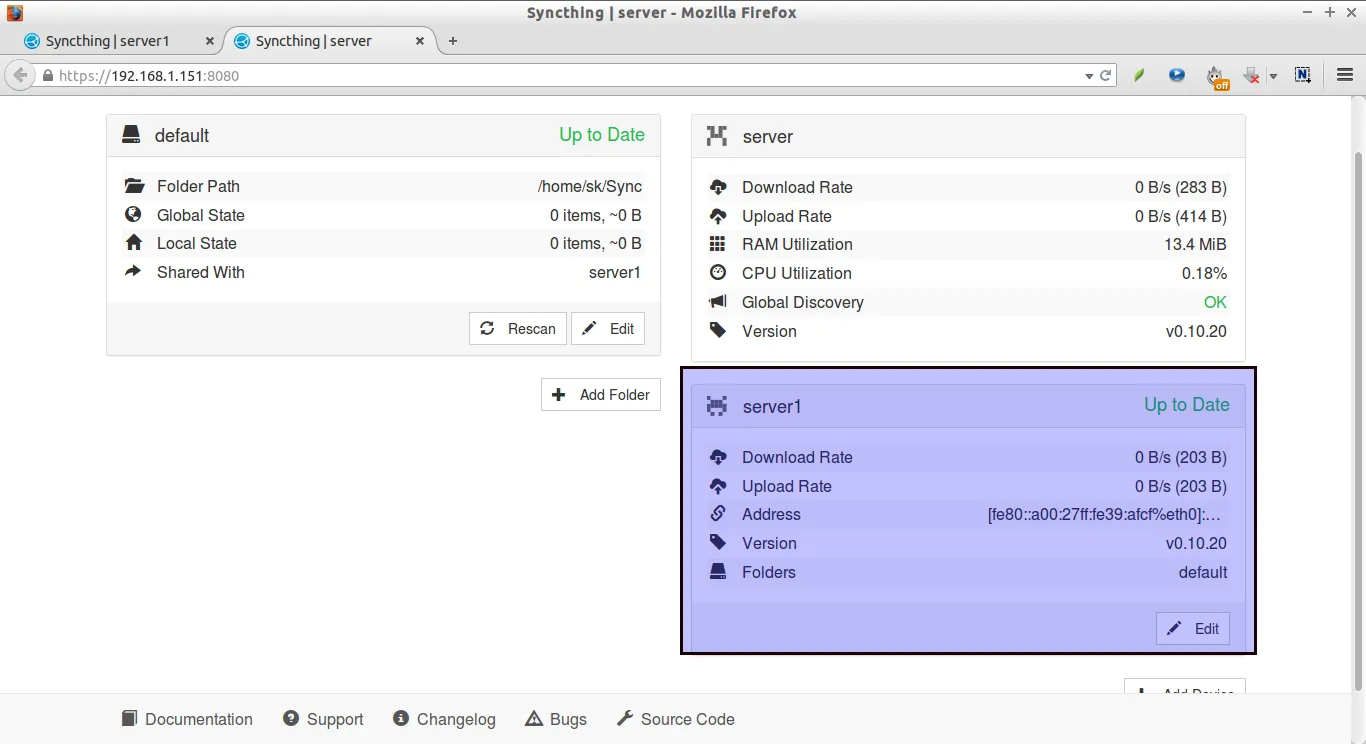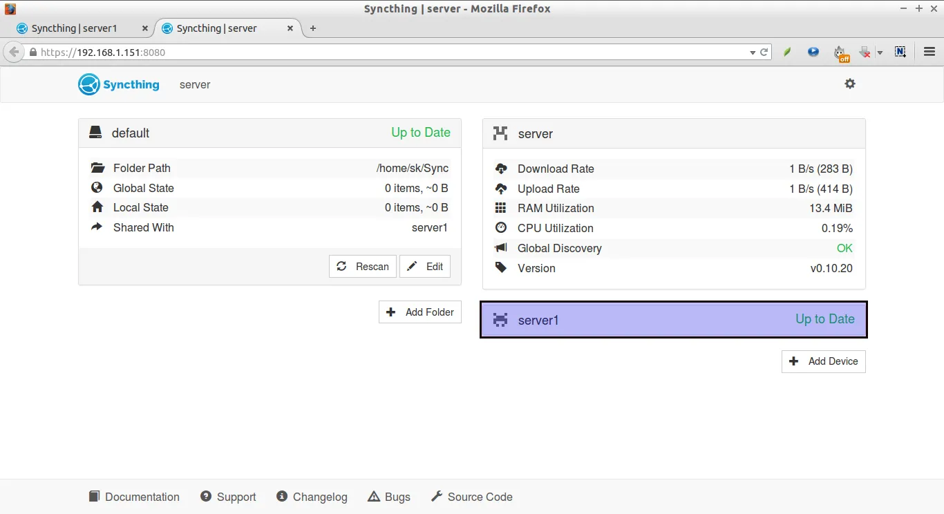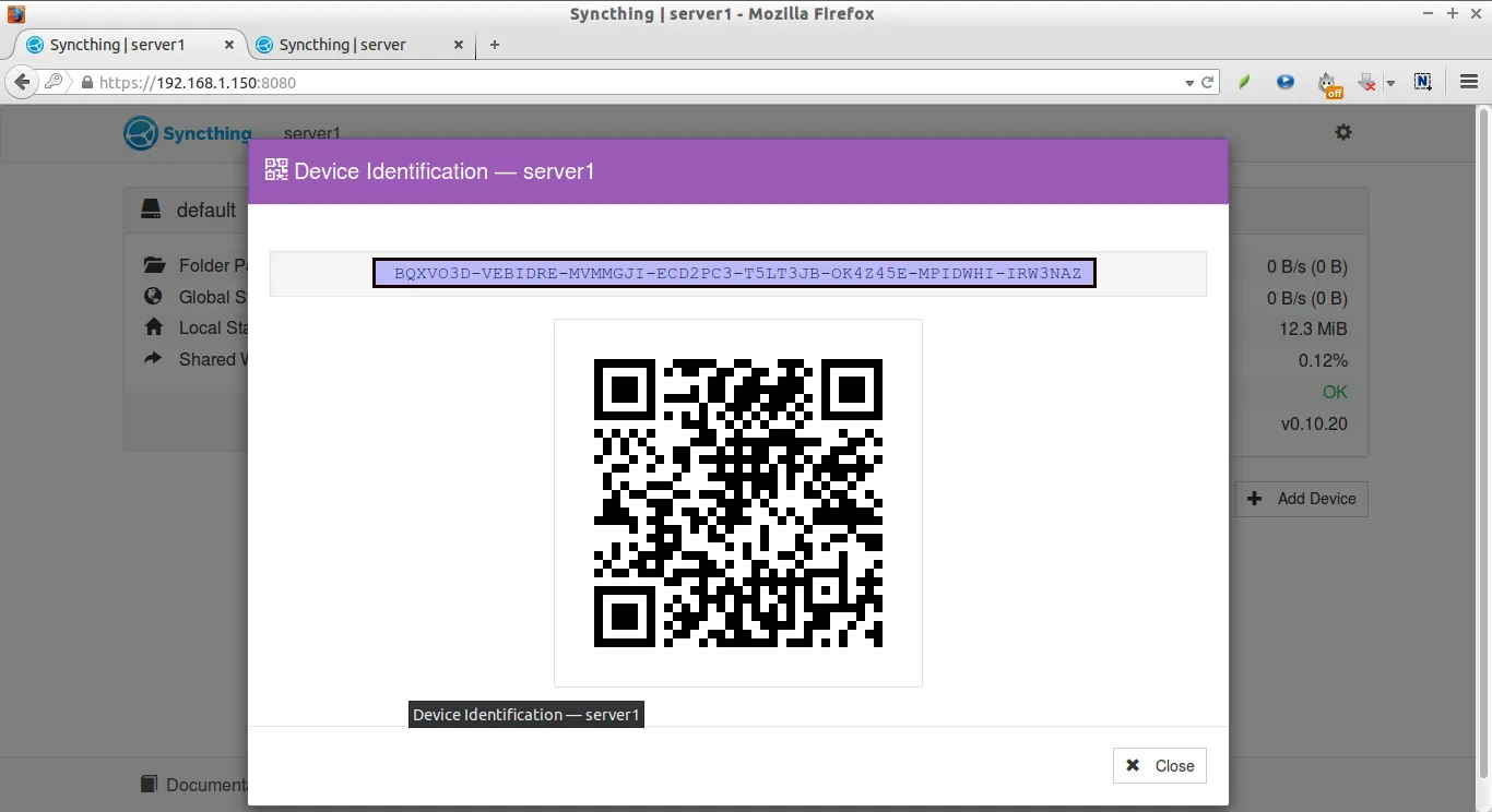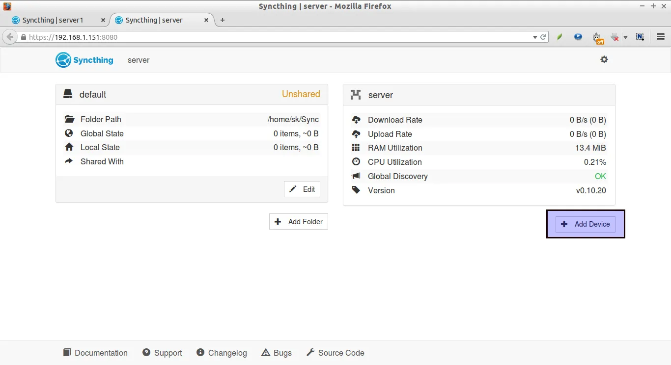 现在,我们到系统1的网页管理界面,你会看到来自系统2的连接和同步请求。点击Add按钮。现在,系统2会要求系统1分享和同步名为default的文件夹。