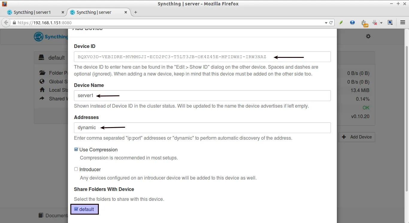 接着会出现下面的界面。在Device区域粘贴系统1 ID **。输入设备名称(可选)。在地址区域,你可以输入其它系统( LCTT 译注:即粘贴的ID所属的系统,此应为系统1)的IP地址,或者使用默认值。默认值为dynamic。最后,选择要同步的文件夹。在我们的例子中,同步文件夹为default**。