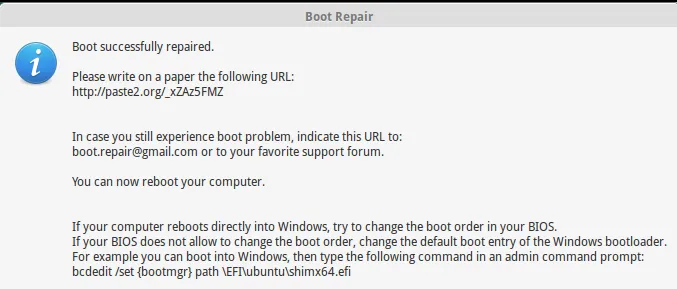 在这一过程结束后,它会提供一个由boot repair的日志组成的网页网址。如果你的引导问题这样都没有修复,你就可以去社区或是发邮件给开发团队并提交该网址作为参考。很酷!不是吗?