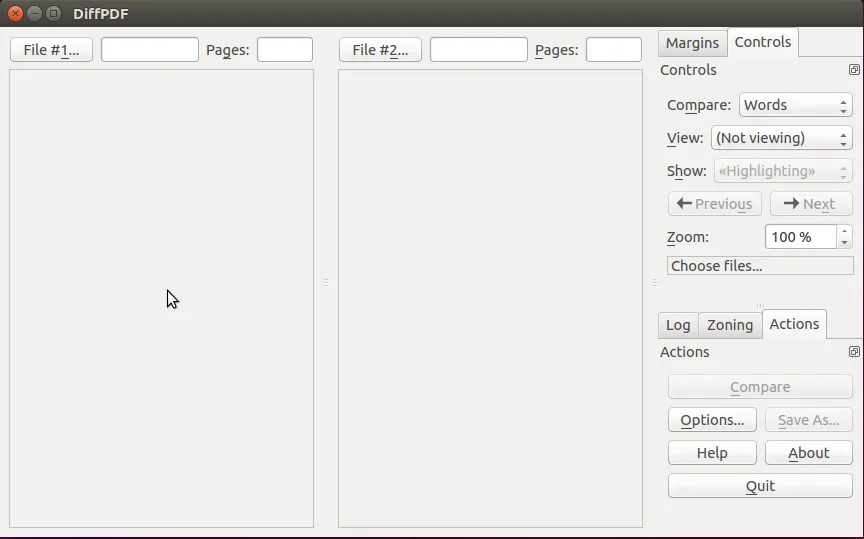 DiffPDF是一个图形化应用程序,用于对两个PDF文件进行对比。默认情况下,它只会对比两个相关页面的文字,但是也支持对图形化页面进行对比(例如,如果图表被修改过,或者段落被重新格式化过)。它也可以对特定的页面或者页面范围进行对比。例如,如果同一个PDF文件有两个版本,其中一个有页面1-12,而另一个则有页面1-13,因为这里添加了一个额外的页面4,它们可以通过指定两个页面范围来进行对比,第一个是1-12,而1-3,5-13则可以作为第二个页面范围。这将使得DiffPDF成对地对比这些页面(1,1),(2,2),(3,3),(4,5),(5,6),以此类推,直到(12,13)。