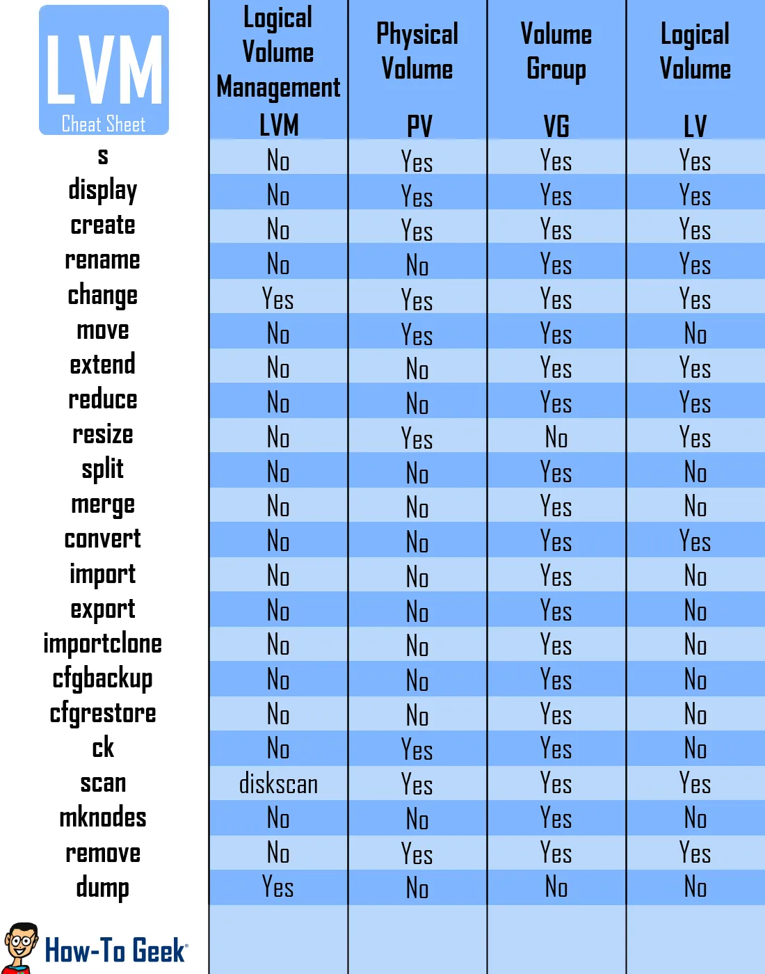 LVM 的大部分命令和彼此都非常相似。每个可用的命令都由以下其中之一开头: