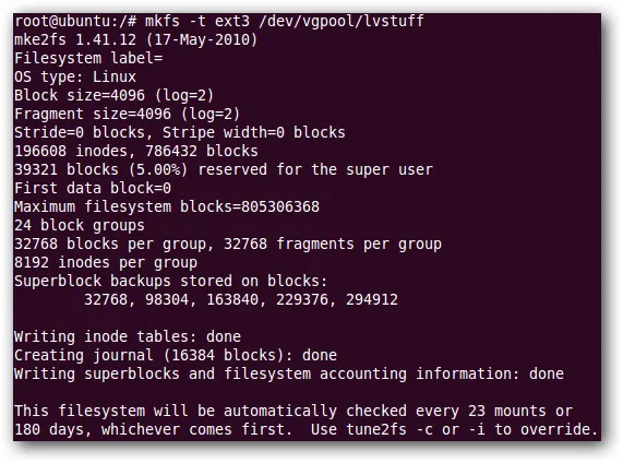 mkfs -t ext3 /dev/vgpool/lvstuff
