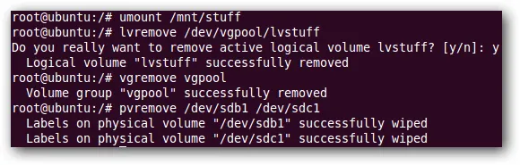 如果你想从卷组中移除一个硬盘驱动你可以按照上面的步骤反向操作,并用 lvreduce 或 vgreduce 命令代替。