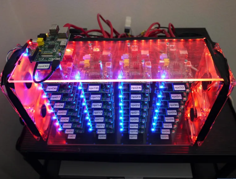 不,这不是我编造的。它一个真实的超级计算机,由超频到 1GHz 的 B 型树莓派的 ARM11 处理器与 VideoCore IV GPU 组成。每个都配备了 512MB 的内存、一对 USB 端口和 1 个 10/100 BaseT 以太网端口。