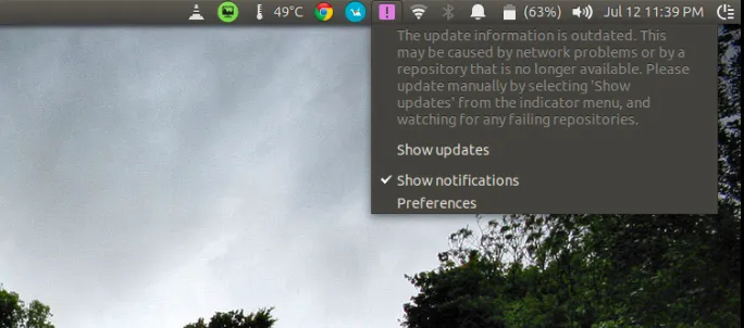 更新信息过时。该错误可能是由网络问题,或者某个仓库不再可用而造成的。请通过从指示器菜单中选择‘显示更新’来手动更新,然后查看是否存在有失败的仓库。