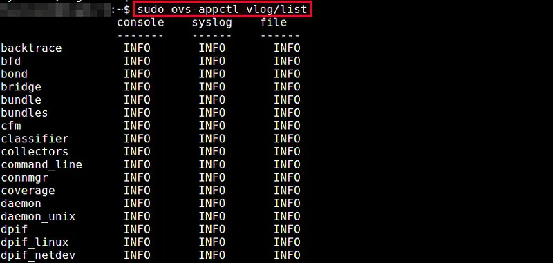 要查看可用模块、工具和各自日志级别的完整列表,请运行以下命令。该命令必须在你启动OVS后调用。