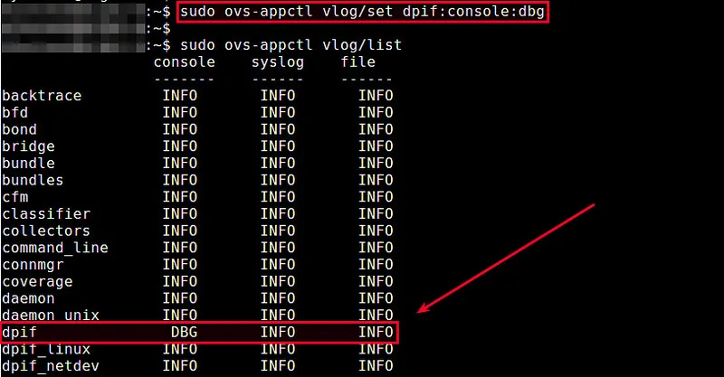 指定任何一个OVS模块,你可以选择性地修改任何特定场合的调试级别。例如,如果你想要在控制台屏幕中查看dpif更为详细的调试信息,可以运行以下命令。