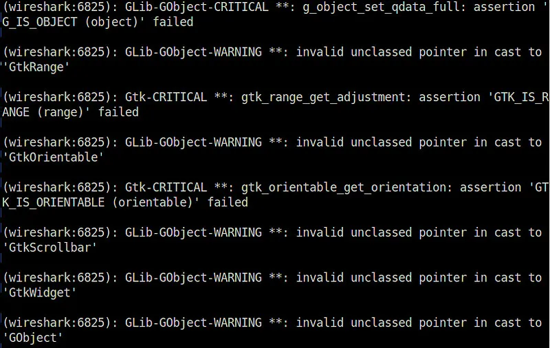 (wireshark:3480): GLib-GObject-WARNING **: invalid unclassed pointer in cast to 'GObject'