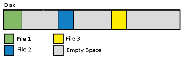 在像 FAT 和 FAT32 这类文件系统中,文件紧挨着写入到磁盘中。文件之间没有空间来用于增长或者更新: