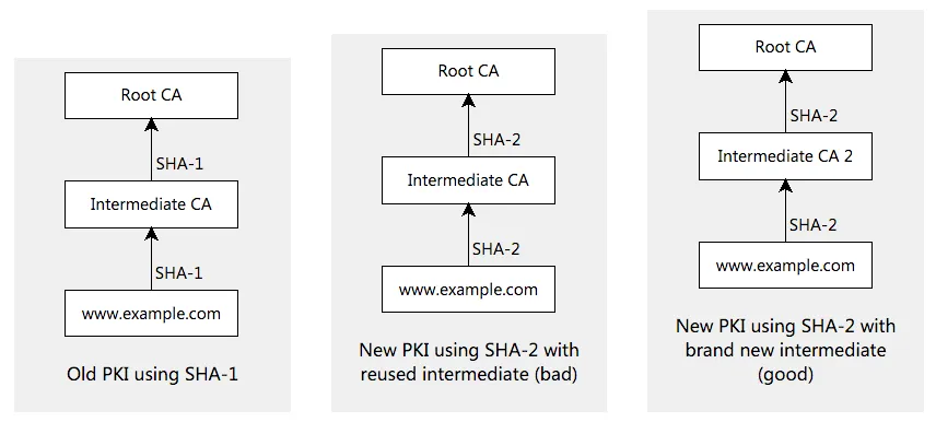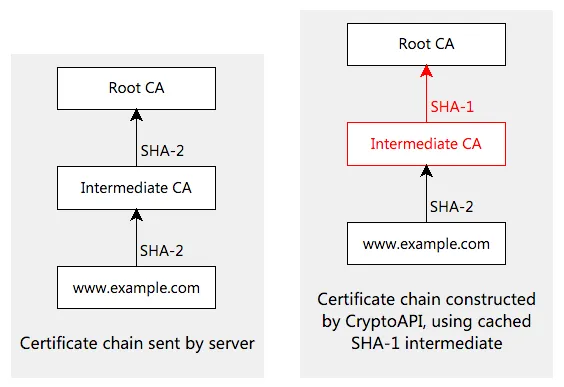 第一种方式是错误的。虽然 CA 可以用已有的中间证书使用 SHA-2 重新签名,但是浏览器也许会缓存着带有旧的 SHA-1 签名的中间证书。如上面解释的,浏览器可以忽略由服务器提供的链证书,即便服务器发送了带有新的 SHA-2 签名的中间证书,客户端依然会使用其所缓存的 SHA-1 中间证书来构建证书链。CryptoAPI 就是这样的。