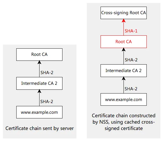 有时候根证书自身也由其它的根证书签名,通常这称之为 交叉签名 。这提供了一个抵达可信根证书的另外一条路径,交叉签名可以让一个不在你的浏览器的可信证书库中的新根证书也可以工作。当浏览器开始信任一个根证书时,交叉签名的证书就不再需要了。然而,和中间证书一样,交叉签名的证书也是可以缓存的,而在 NSS 中一个 bug 会导致 Linux 上的 Chrome 使用缓存的交叉签名的根证书,即使有更短和更新的证书链存在。如果这个缓存的交叉签名证书正好使用 SHA-1,Chrome 就会使用这个有问题的证书链并显示一个红叉,而不管你的服务器是否发送了全都使用 SHA-2 的证书链。