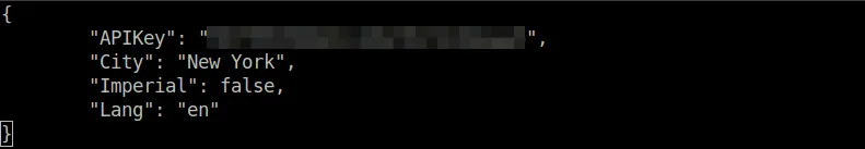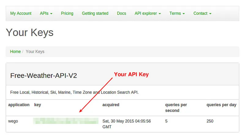 第一次运行 weg 会生成一个配置文件(~/.wegorc),你需要指定一个天气 API key。 你可以从 worldweatheronline.com 获取一个免费的 API key。免费注册和使用。你只需要提供一个有效的邮箱地址。