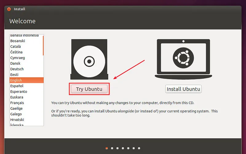 从Ubuntu桌面版CD/DVD或者USB启动后,在欢迎页面点击“Try Ubuntu”。