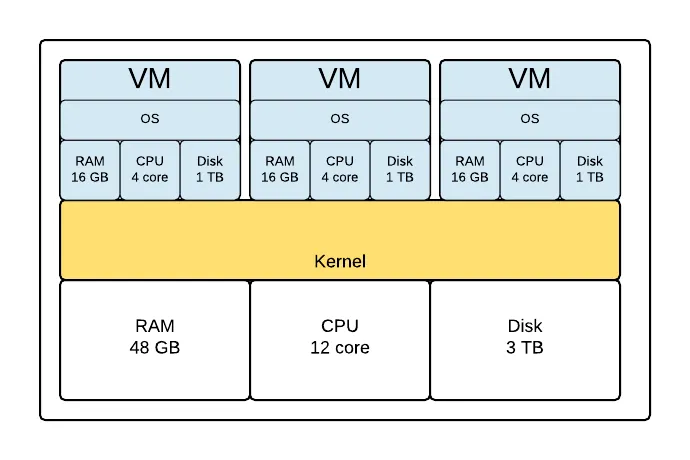 虚拟机允许你在一台硬件主机上运行多个模拟计算机。这是一个简单的示意图:
