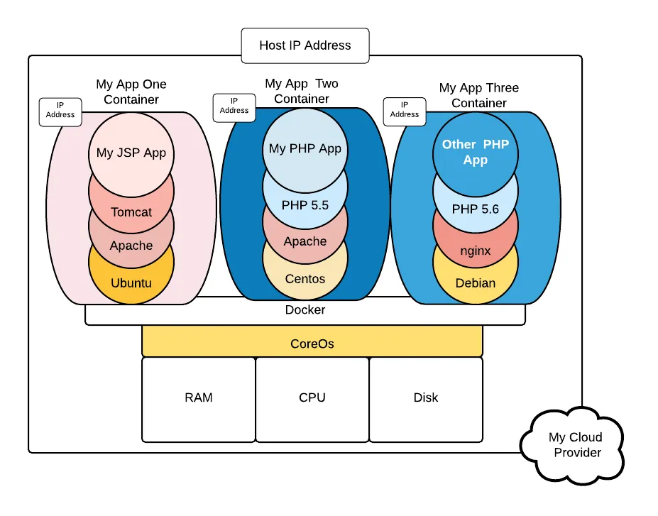 所有上面描述的容器的各种功能都由一个称为 容器管理器 的软件控制。现在,最流行的容器管理器是 Docker 和 Rocket。上面的示意图展示了容器管理器是 Docker,宿主操作系统是 CentOS 的主机情景。