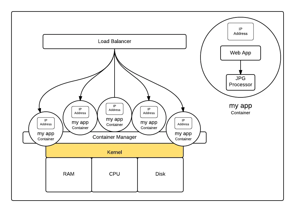 这是第三遍,容器是拥有不同 IP 地址从而使其成为网络上可识别的独立 Linux 进程。下面是一个示意图: