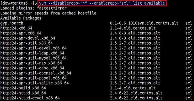 $ yum --disablerepo="*" --enablerepo="scl" list available
