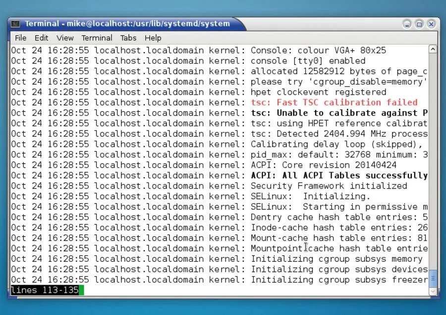 像许多其他的 Systemd 命令一样,该命令将输出通过管道的方式引向 less 程序,因此您可以使用空格键向下滚动,键入/(斜杠)查找,以及其他熟悉的快捷键。您也能在此看到少许颜色,像红色的警告及错误信息。